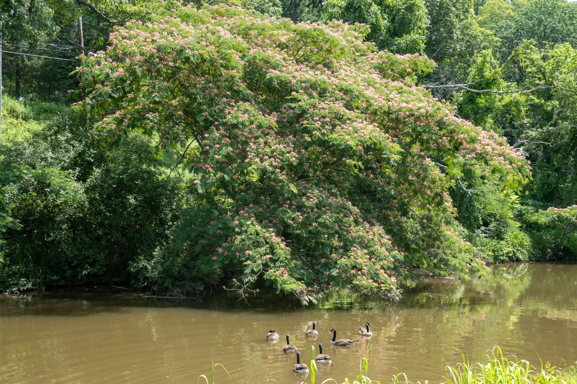 1) Starburst blossoms of mimosa trees line the canal. Beautiful but invasive. 2) Mother and duckling wood ducks climb past a wary river cooter. 3) Steph scoots past a great blue heron.