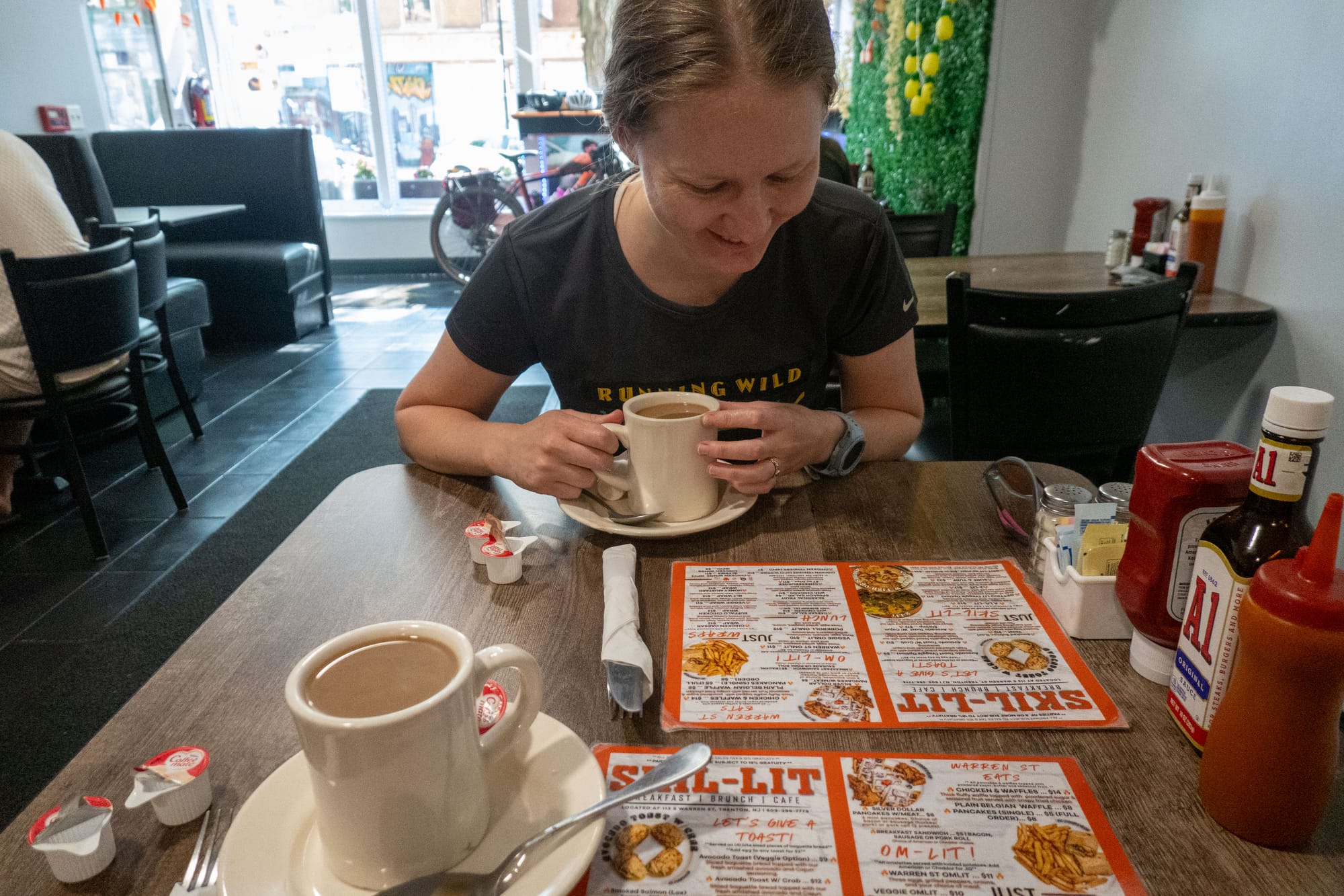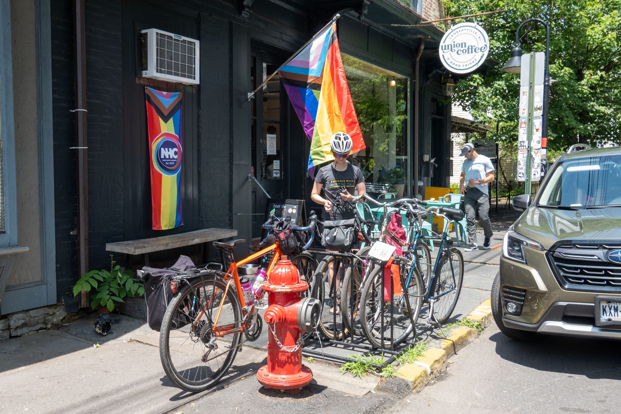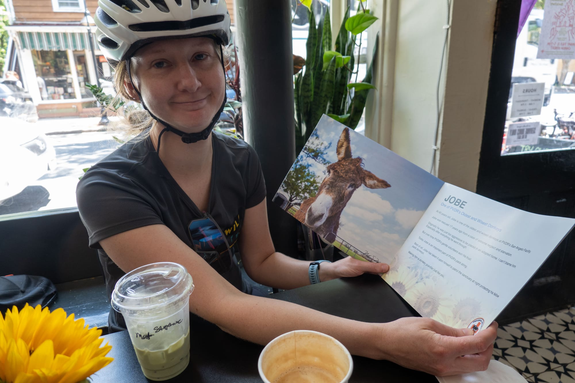 1, 2) Treats & reads at Union Coffee in Lambertville, NJ. 3) Riding past Second Empire rowhomes in Lambertville.