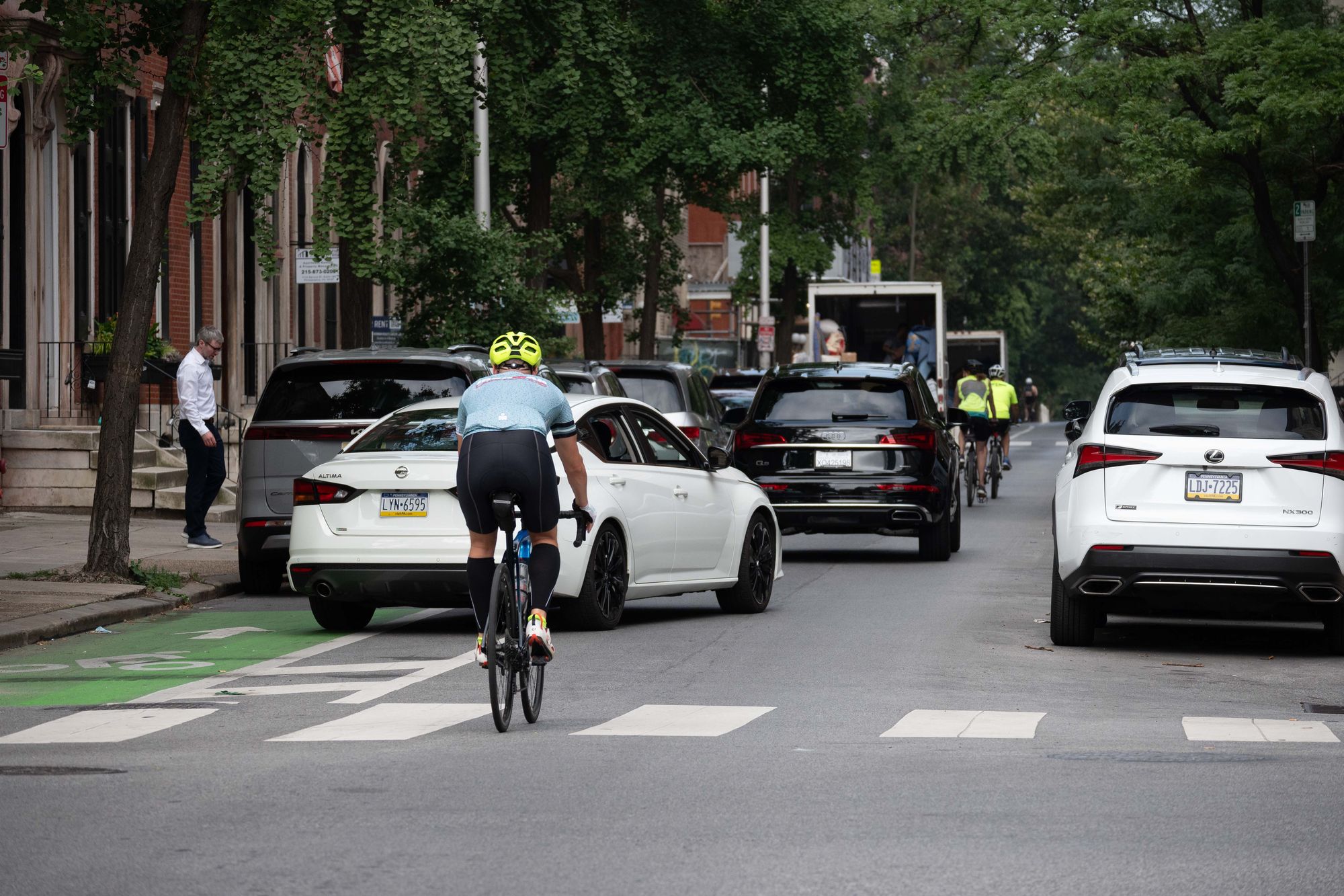 Essentially connecting the Delaware and Schuylkill River waterfronts in both directions across Center City, the Spruce & Pine bike lanes are some of the most heavily trafficked "trails" in the regional network. At the same time, they are separated from traffic only by a narrow painted buffer, and there is nothing preventing a collision between a cyclist and a motor vehicle. Since there is no physical barrier, the bike lanes are nearly always obstructed by parked and standing cars and commercial vehicles, forcing cyclists into traffic where they are threatened with physical harm or harassment by impatient motorists.