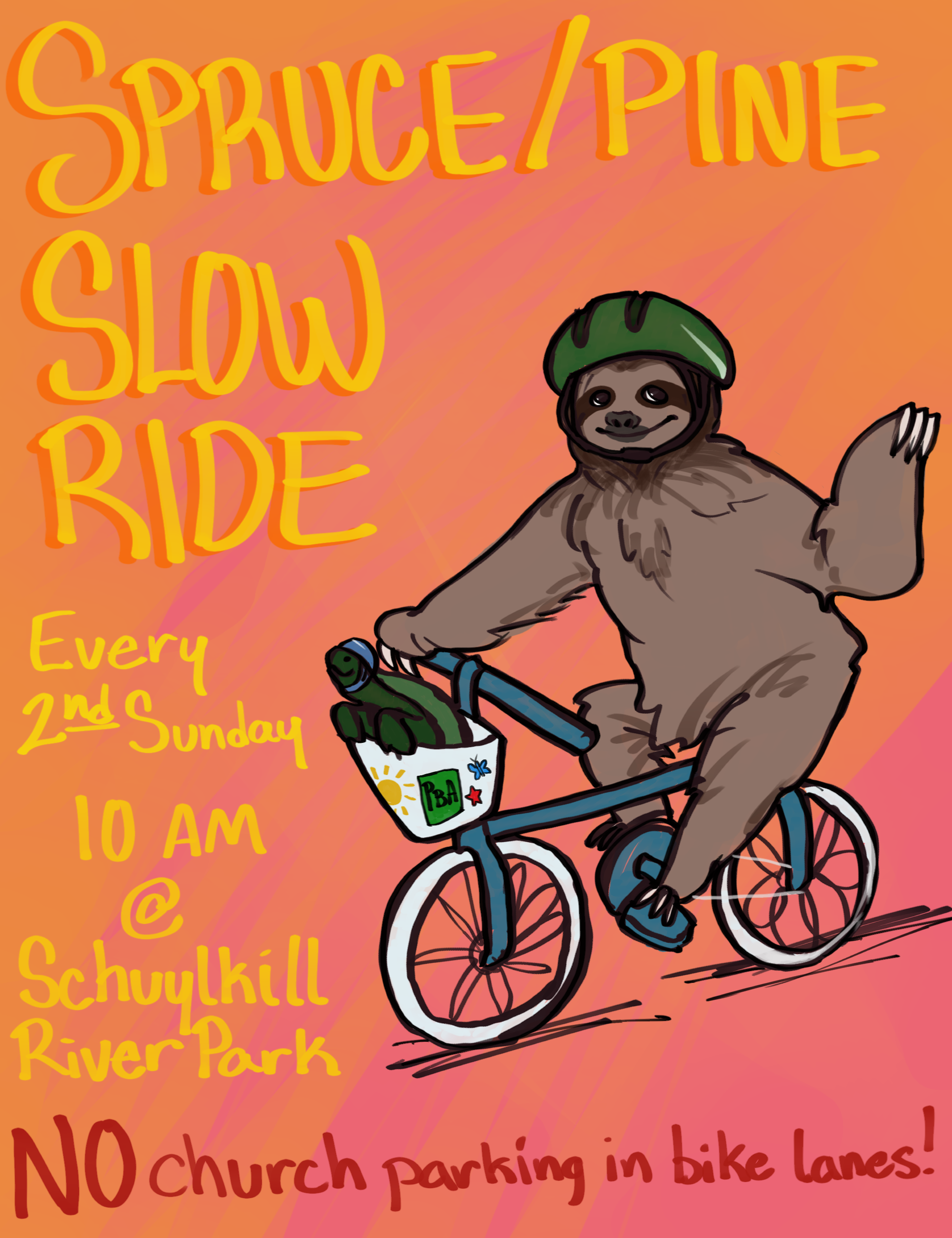 The ride will start at Schuylkill River Park at 10am and follow a continuous loop on the Spruce & Pine Street bike lanes where available. Where the bike lanes are blocked, as anyone who has ridden in Center City knows is as inevitable as tourists at the Liberty Bell, participants will legally occupy the primary travel lane while protesting the chronically unsafe conditions. Participants will carry decorated signs and are instructed to obey all traffic laws, engaging bystanders with nothing but kindness and courtesy. Sunday Slow Ride is ultimately about being good neighbors and sharing public space for the greatest benefit.