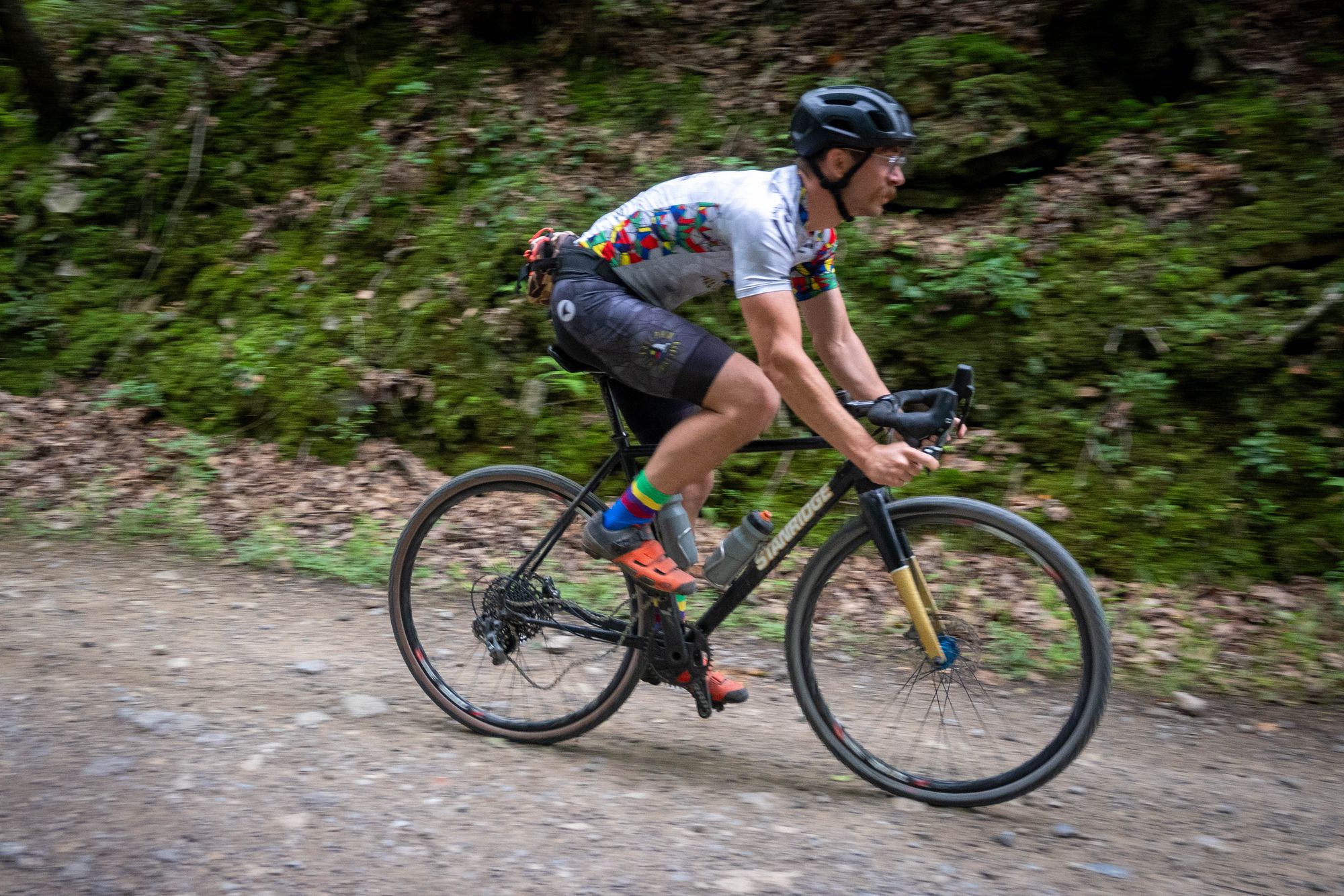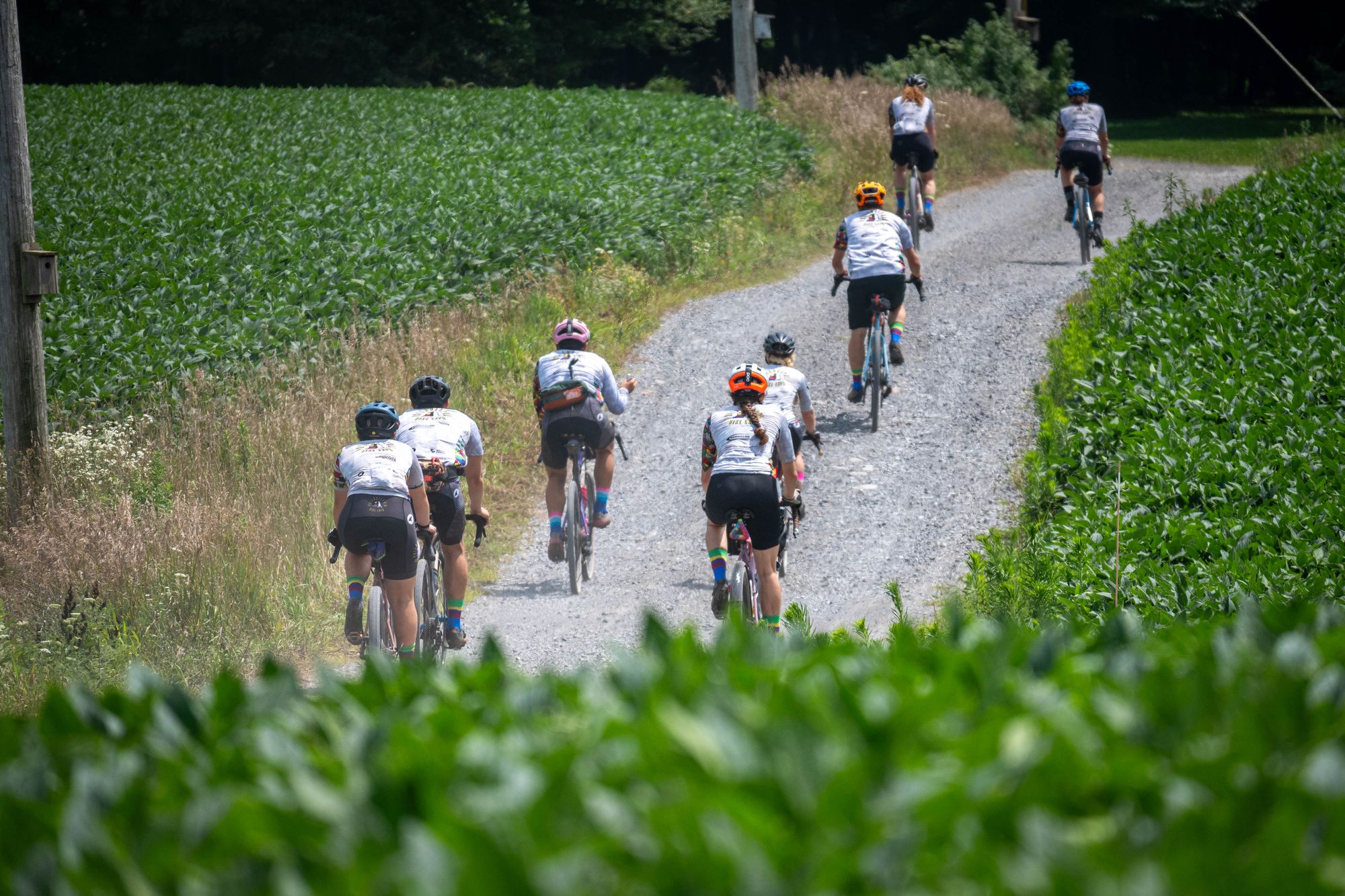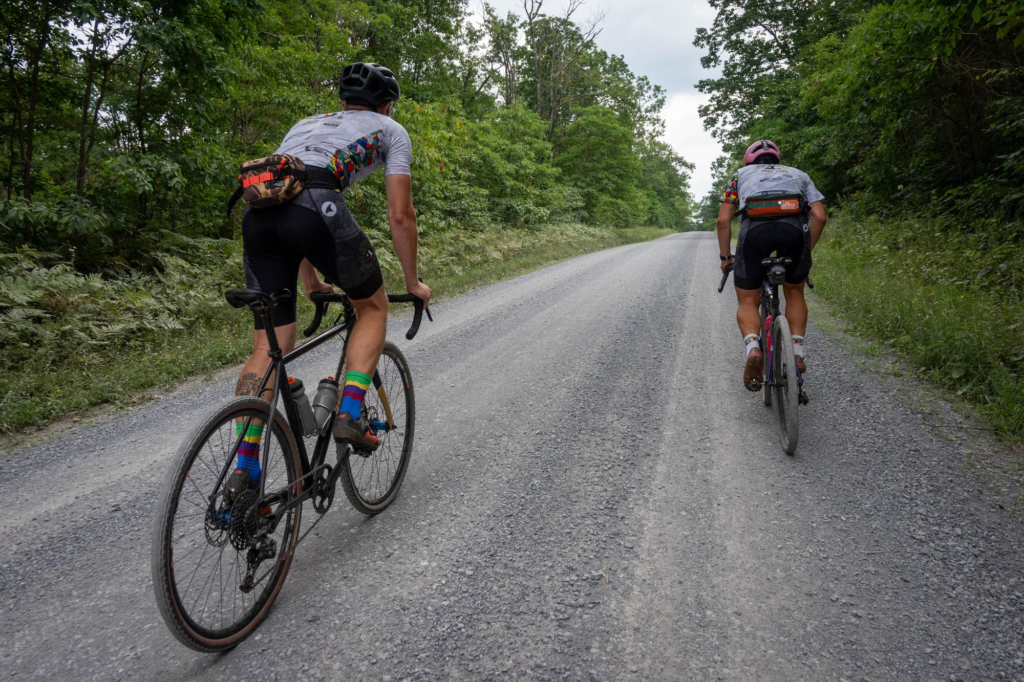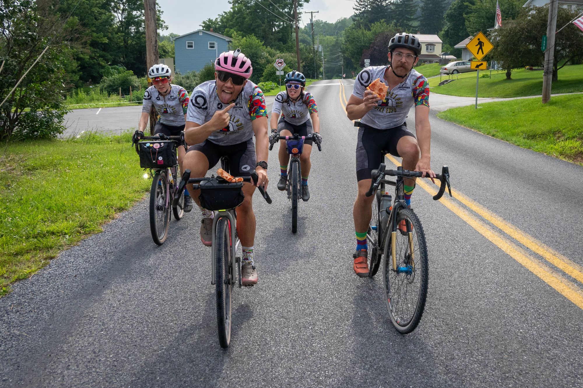 Idyllic country roads led us back to the ridge for a long but gently graded gravel climb. The rocky downhill tested us further by rattling bones and drivetrains. Regrouping at the base, we howled over the situation and grabbed hand-up pizza slices from our friends in the support vehicle.