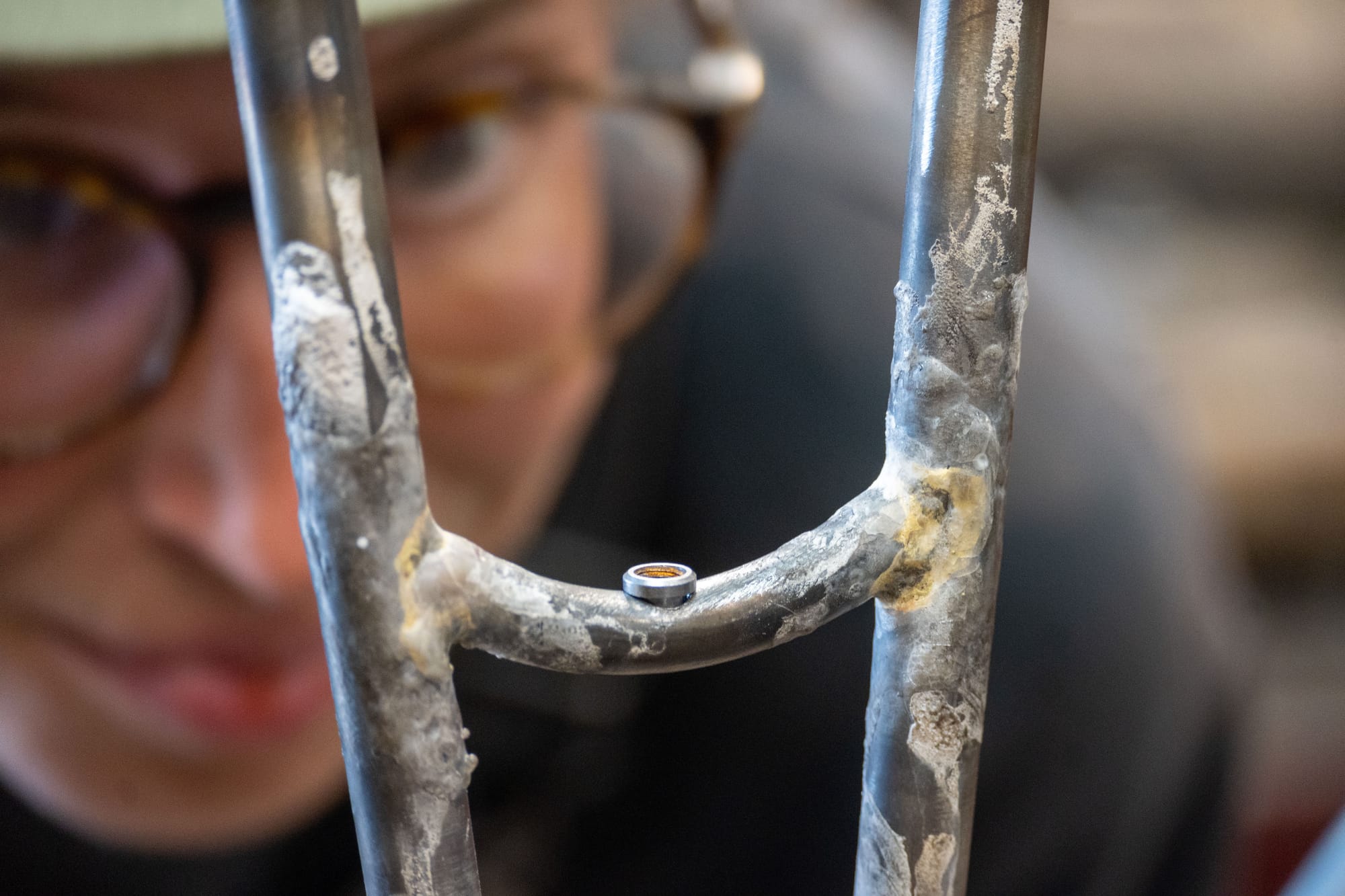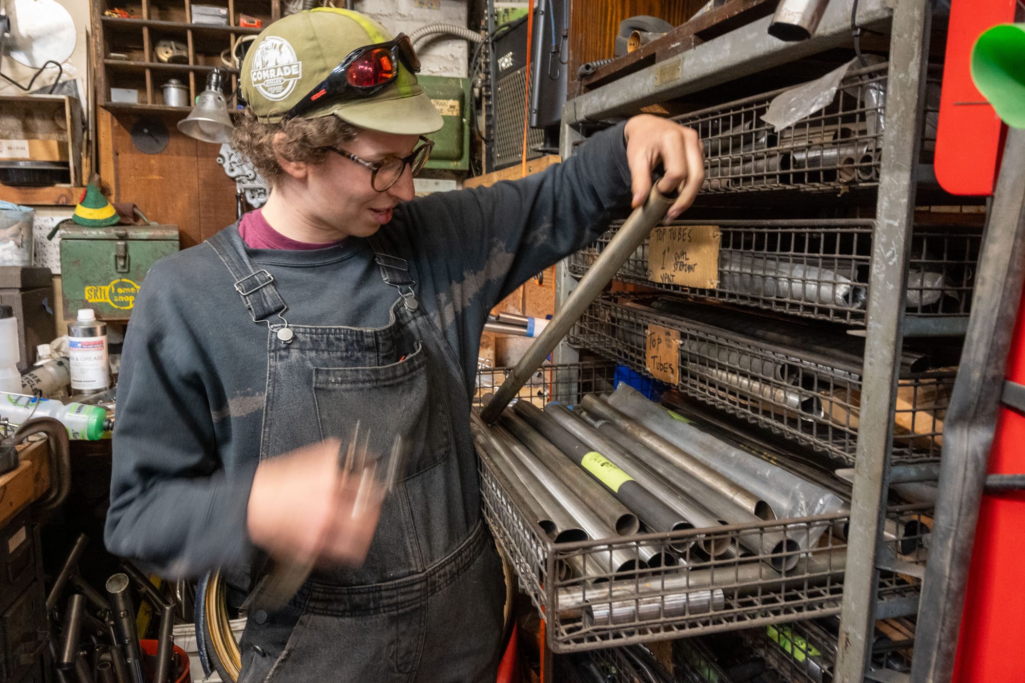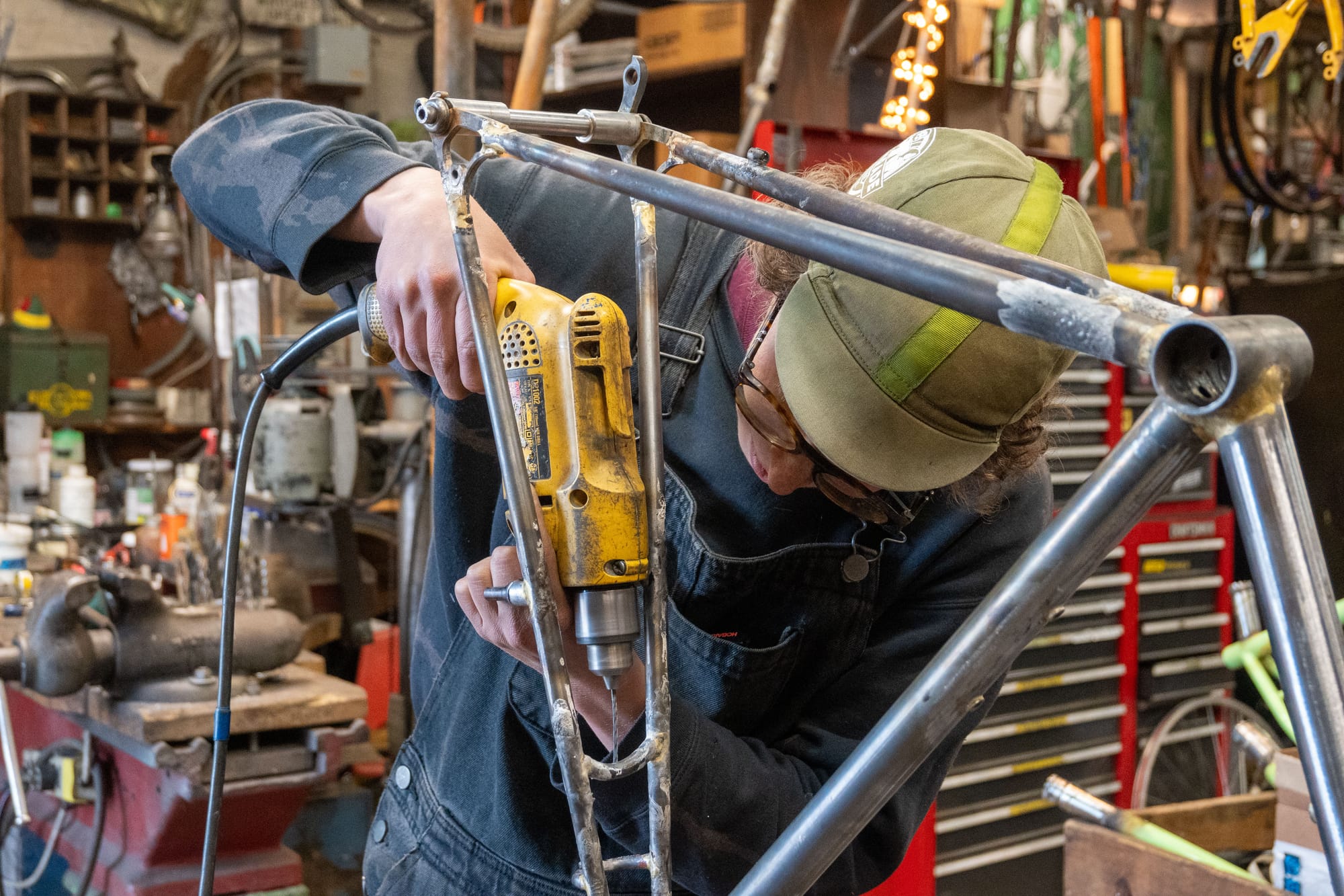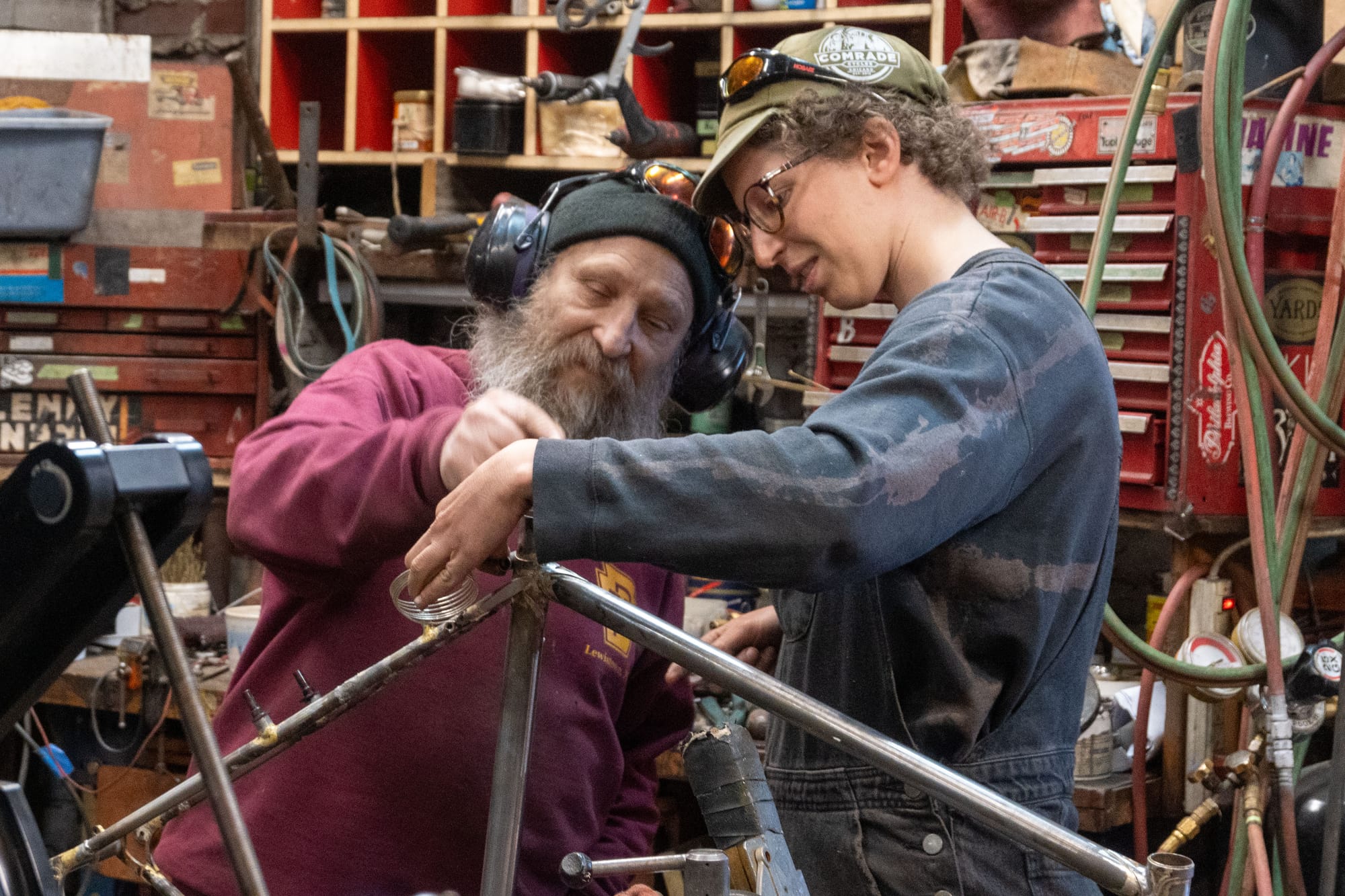 Apprenticing with Stephen Bilenky gave Simona the skills and resources she would need to build her bike. Bilenky has been building bikes since 1983. His shop in Olney is a wonderland of raw materials, tools, machines, and bikes. Every twitch of the eye uncovers a new easter egg or a previously unimaginable quirk of cycling history. Among other gnarly projects like Junkyard Cross, Stephen and his daughter Bina founded the Philadelphia Bike Expo, which has grown to become one of the country's leading cycling trade shows.