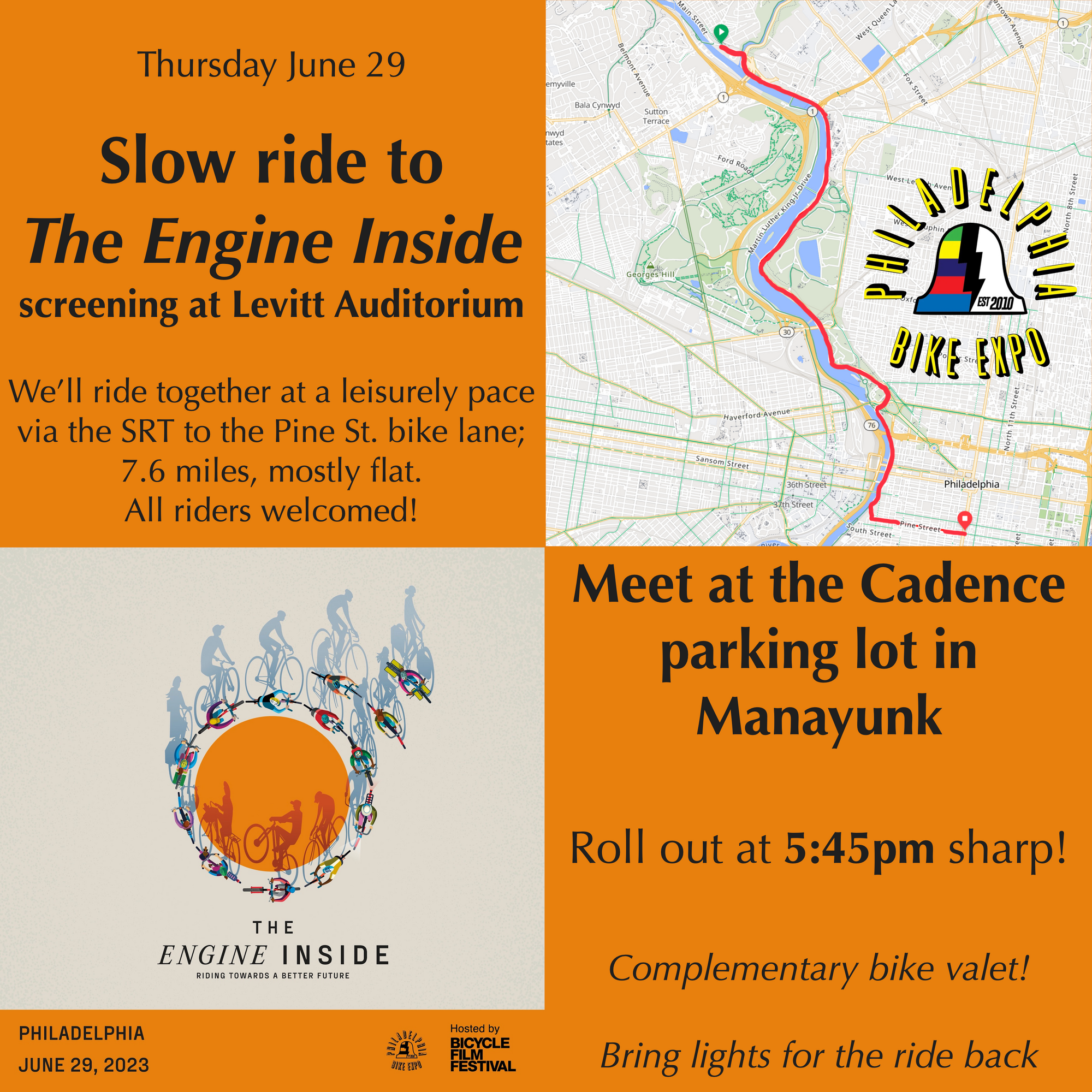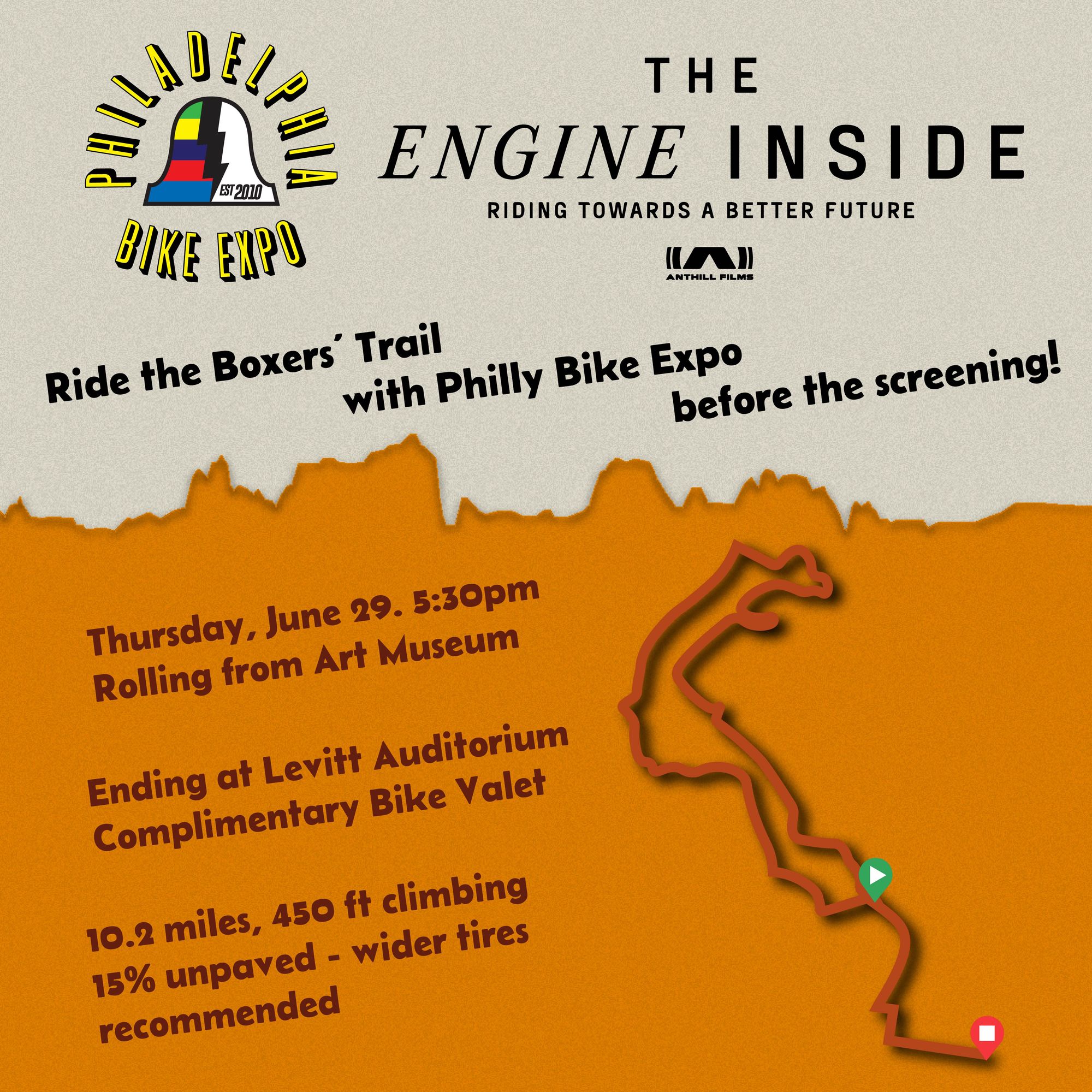 Philly Bike Expo will also be hosting two pre-screening rides that will end at the event where a complimentary bike valet will be staged directly outside the theater on Broad Street. The first is a beginner-friendly ride from Manayunk to Center City on the SRT and Pine Street bike lane. The second explores the Boxers' Trail and MLK Drive featuring mixed terrain and some climbing. Both rides are open to all. Anyone attending the screening may take advantage of the complimentary bike valet.