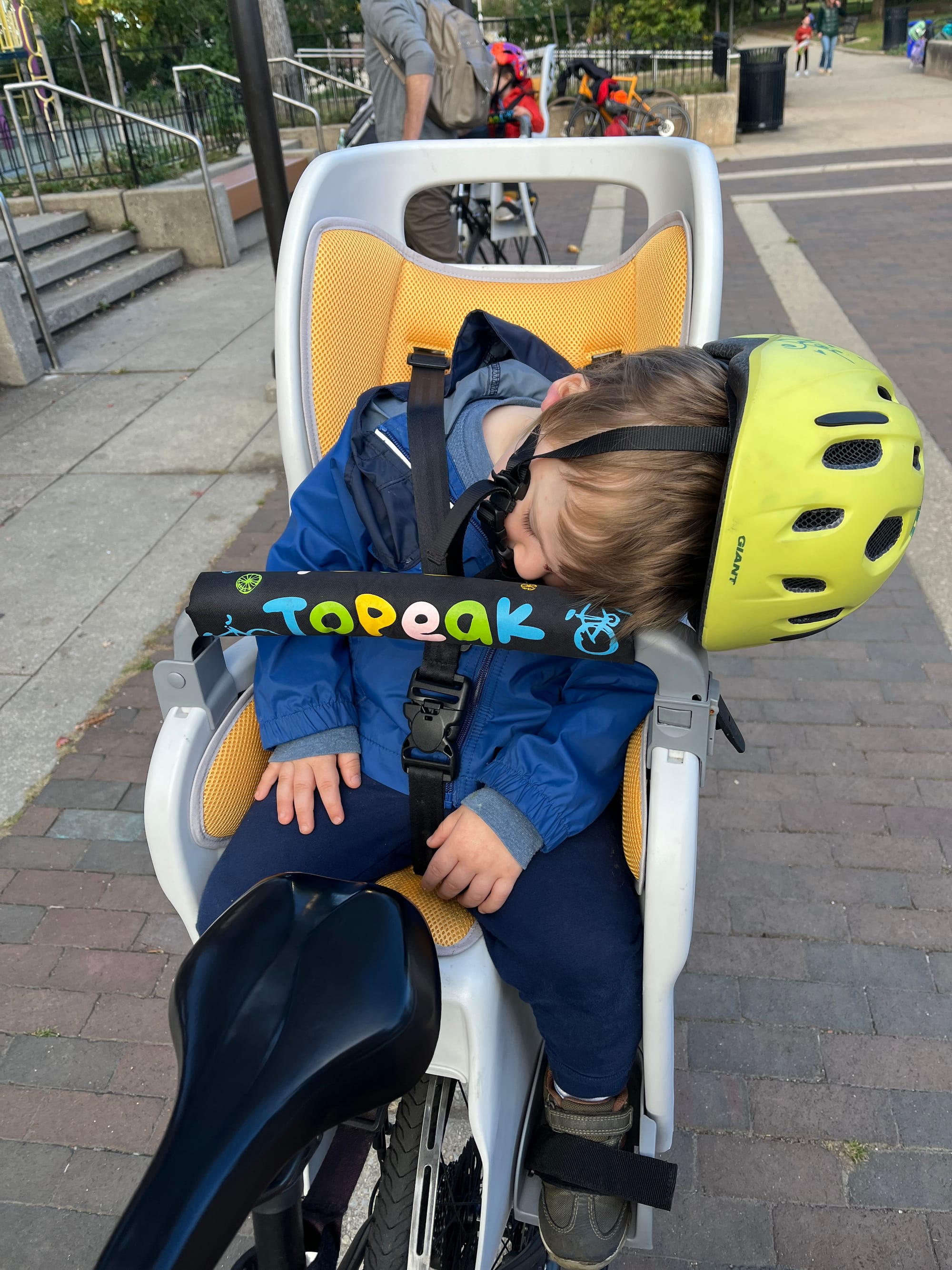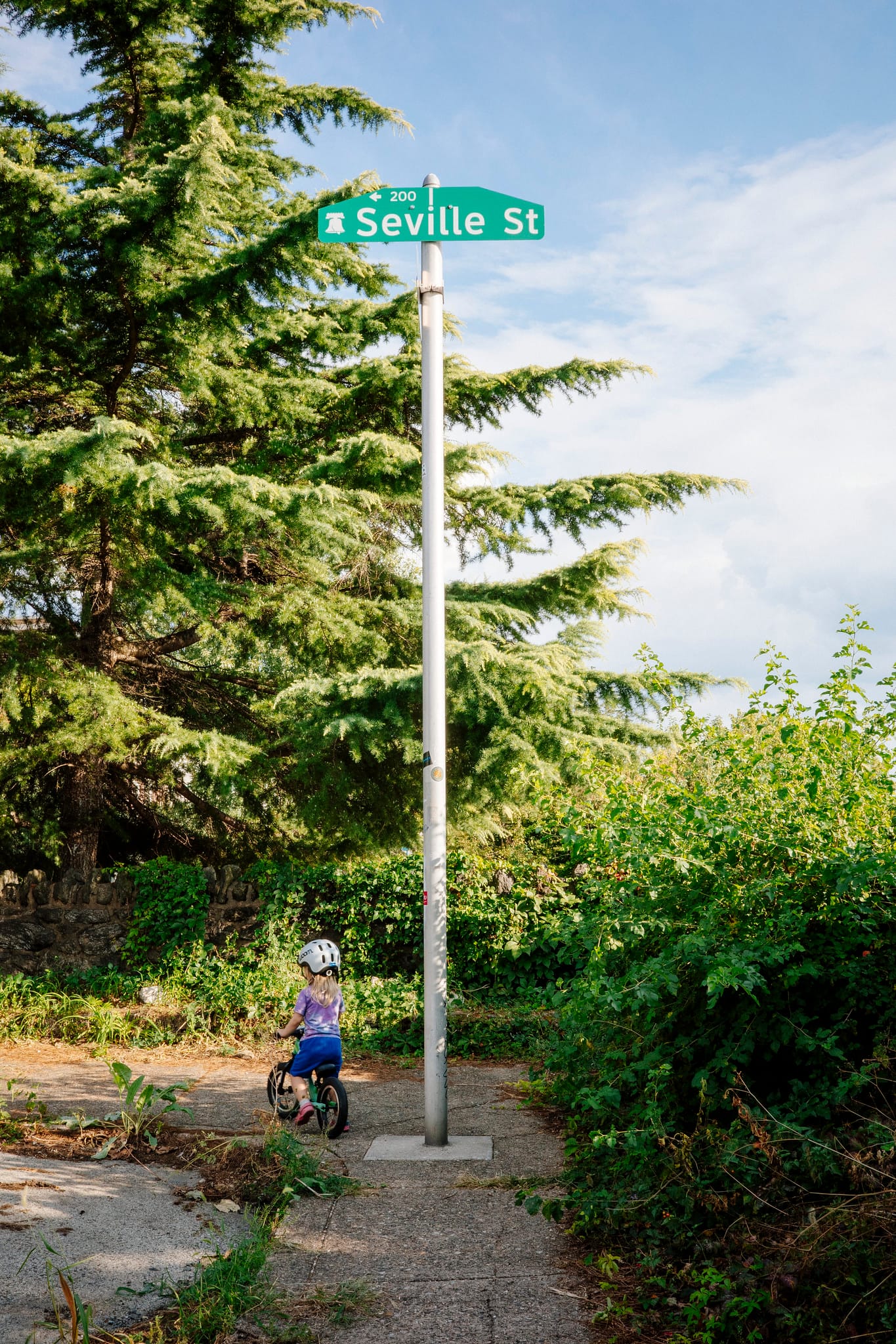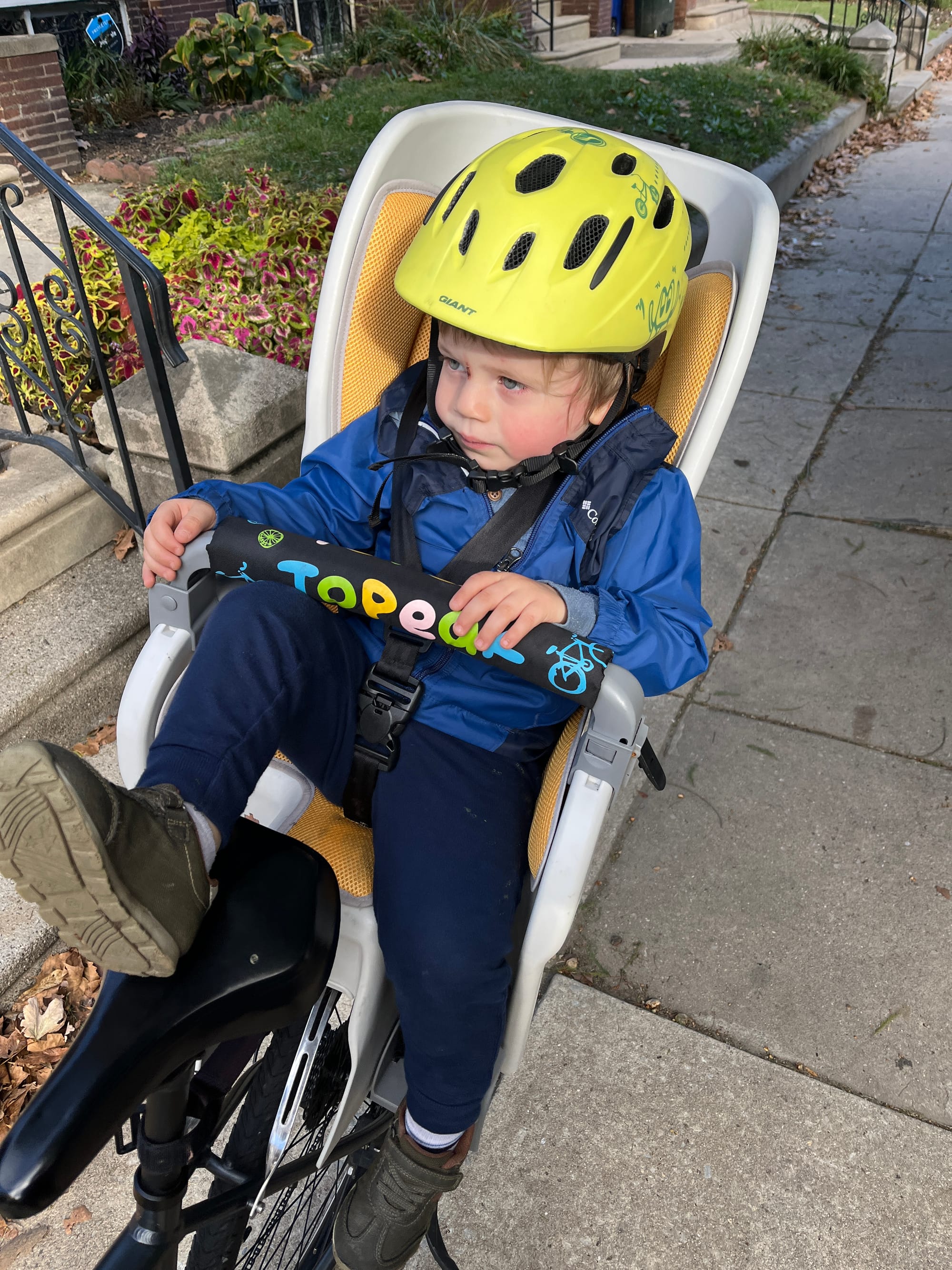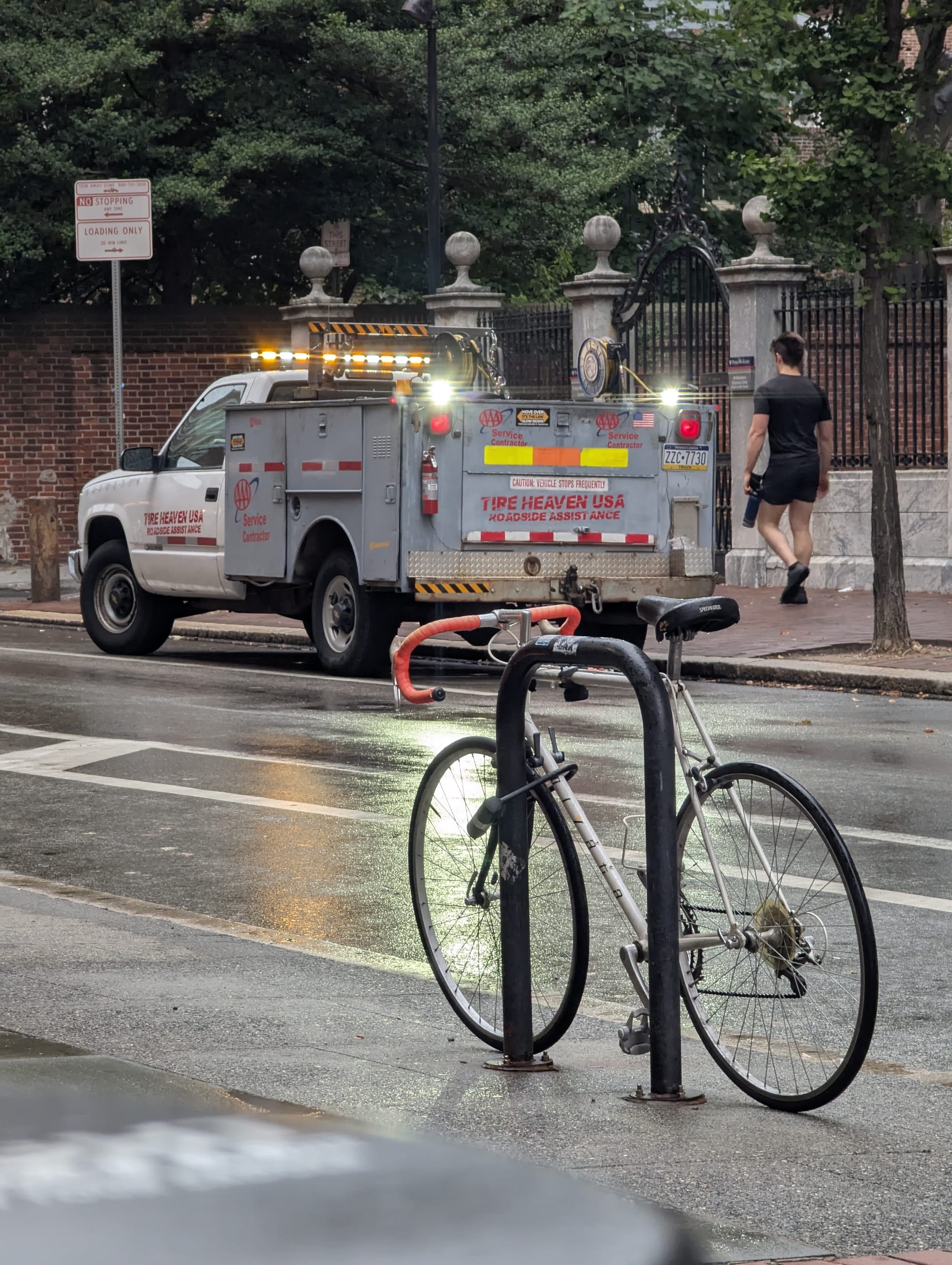 1) Spruce St Bike Lane Loading Zone @ PA Hospital; Indego seat in foreground. Cemetery, hospital, Tire Heaven truck emergency lights evokes mortality! | Michael Novak. 2) In a toddler voice: “Faster! More bicycle!” | Megan Shannon.