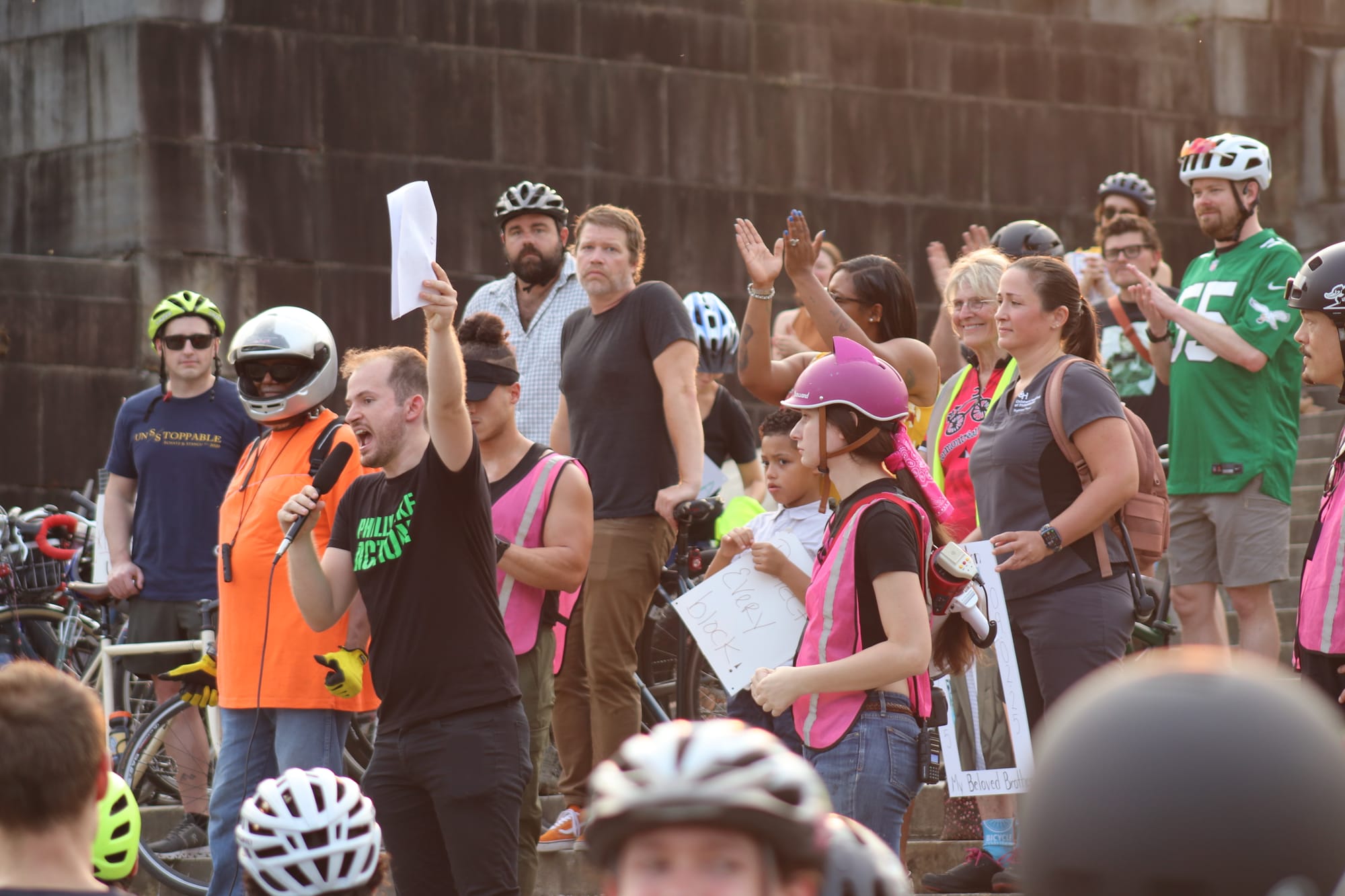 Philly Bike Action's "Concrete Now!" rally with Gabriel leading a call to action for safe streets across Philadelphia.