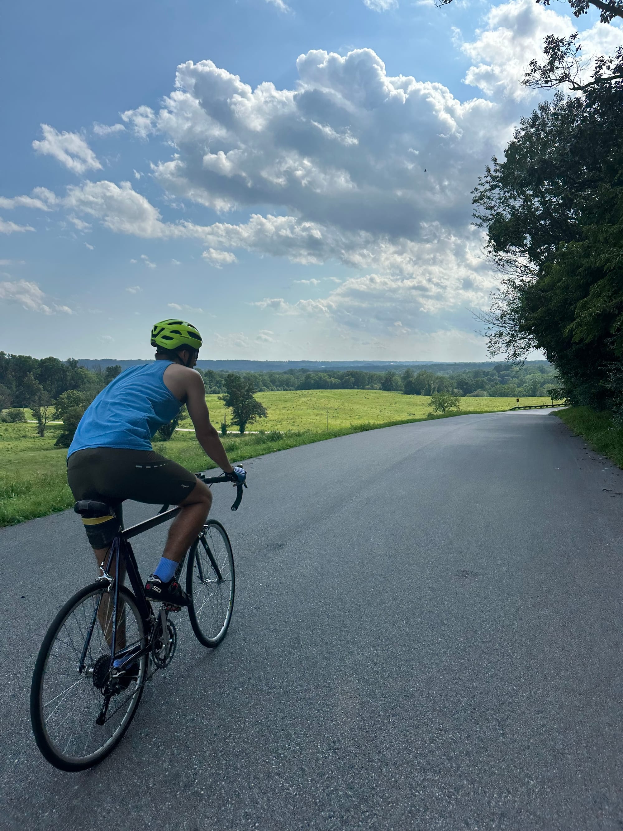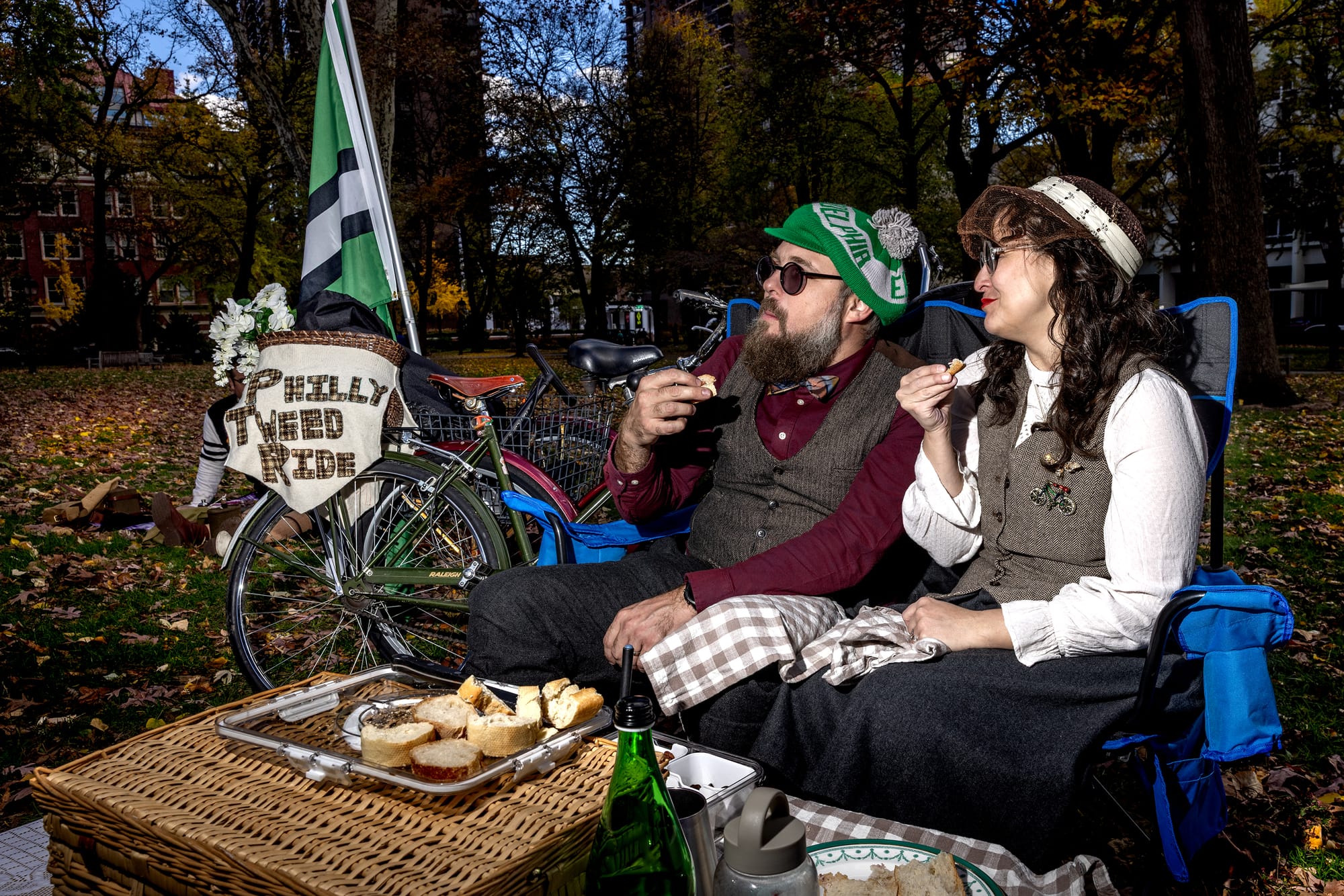 1) Sky, Forest, Pavement (Kelly Drive, May 20 2025) | Stefan Zajic. 2) Cyclists taking a a midway break for lunch on the Philly Tweed Ride | Peter Arquette.