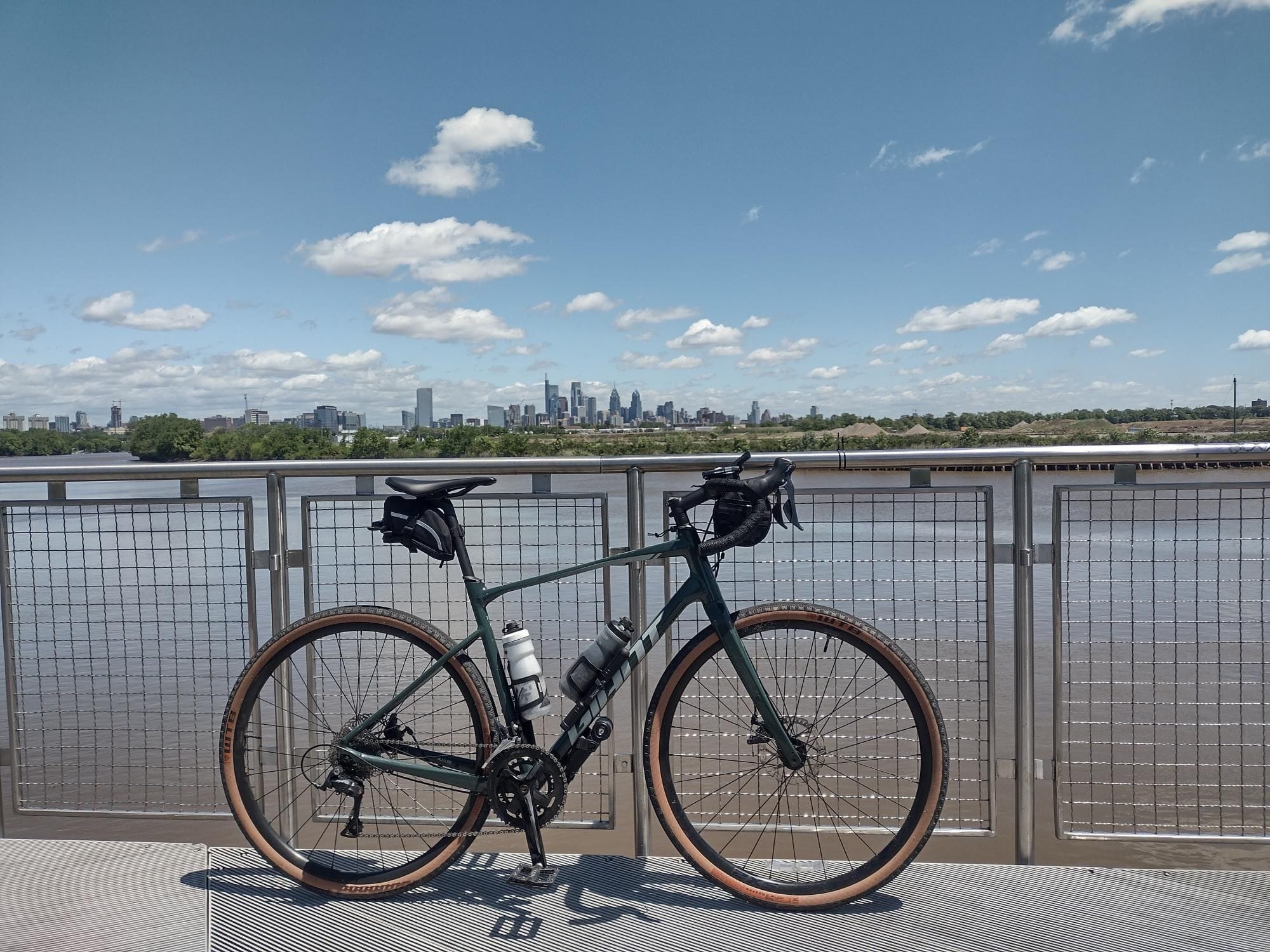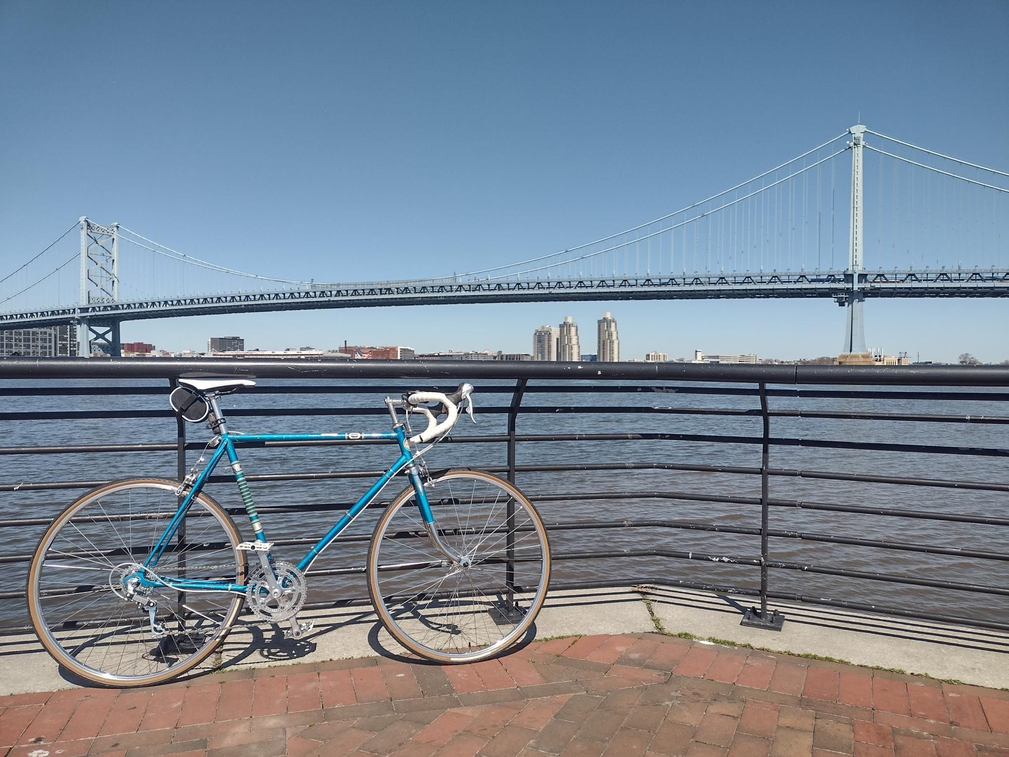 1) OVERALLS Route - final miles, coming from Erie and going to Philly | Jake Haines. 2) Shot of Ben Franklin bridge from the Camden waterfront. In the photo is a refurbished Sears 10-speed that my dad rode in the city in the 70s. | Peter McLoone.