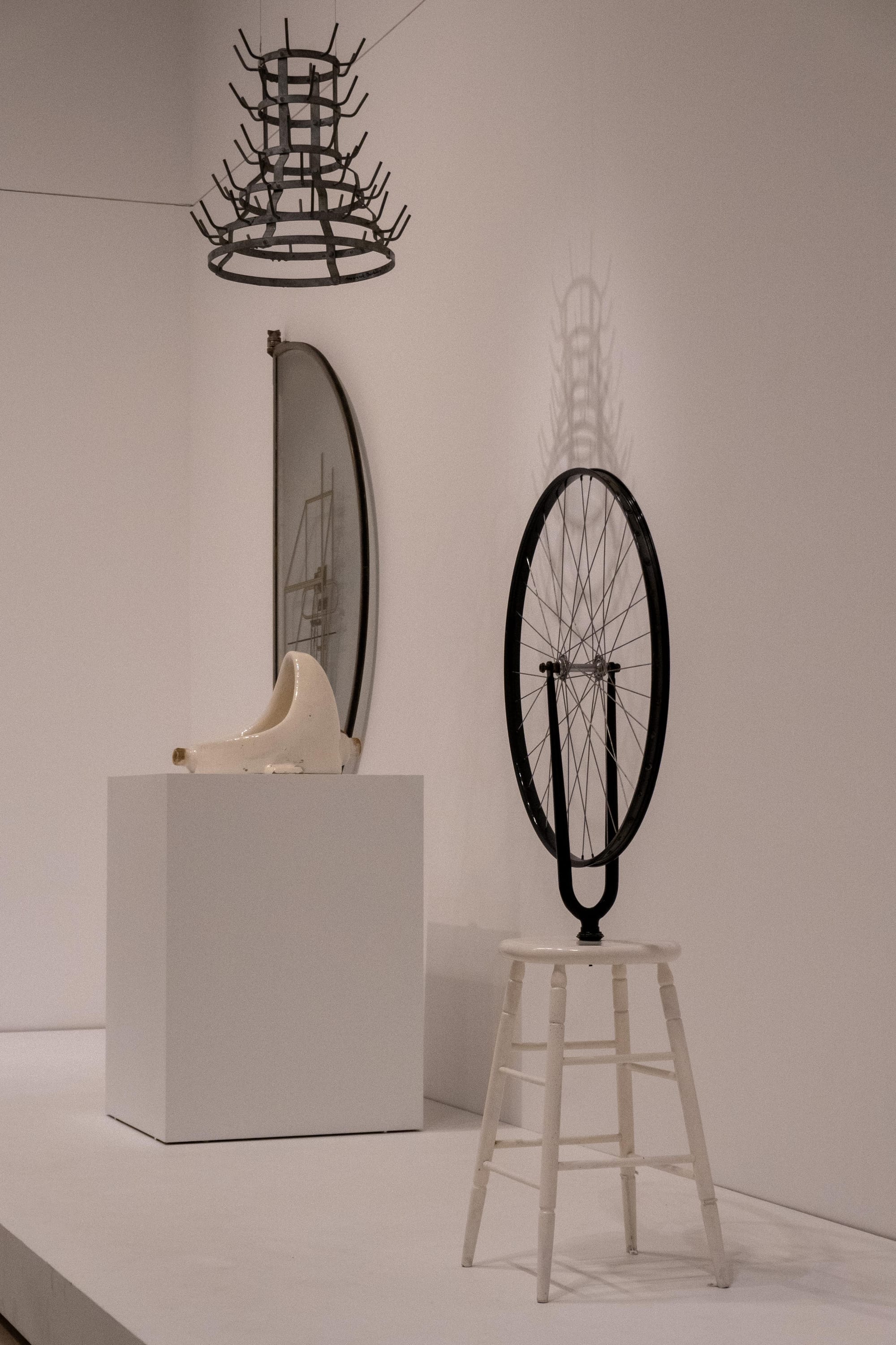 Bike parts mounted to a bench before a porcelain fountain in the Art Museum and at the El Bar.